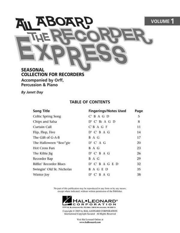 Seasonal Collection for Recorders Celtic Spring Song Chips and Salsa Curtain Call Flip flop five The Gift of G-A-B The Halloween 'Boo'gie Hot Cross Fun The Kiltie Jig Recorder Rap Riffin' Recorder Blues Swingin' old St. Nicholas Winter Joy