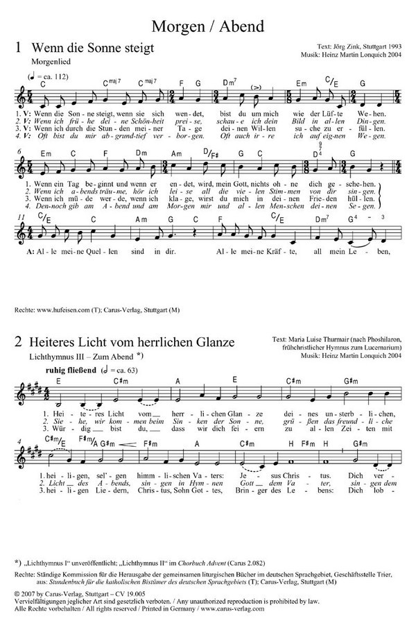Neue Geistliche Lieder und Kanons Morgen / Abend Lob / Dank Vertrauen / Hoffnung Auftrag Bitte Taufe Trauung / Jubiläumshochzeit Tod Gesänge zu Eucharistiefeier Advent Weihnachten Passion / Ostern Pfingsten Maria Engel / Heilige Biblische Lieder