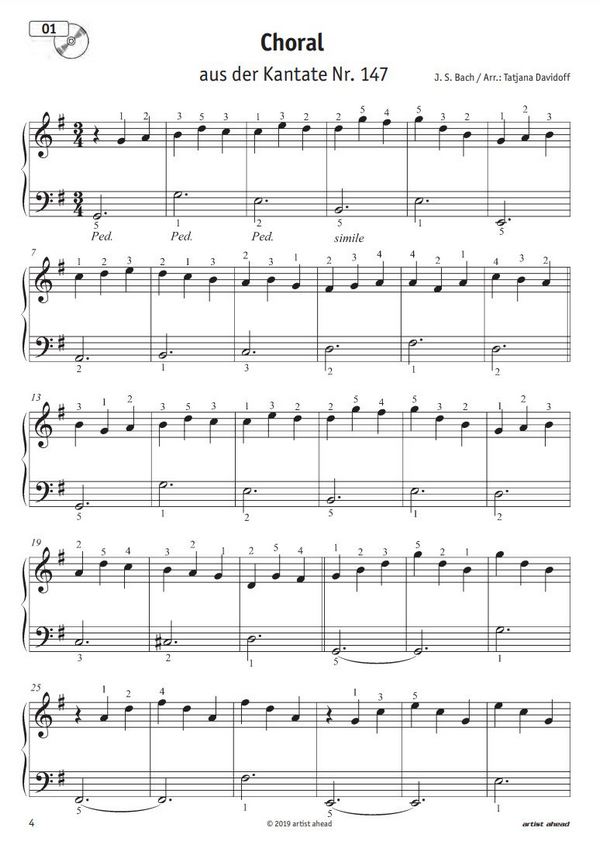 Klassik und Romantik mal einfacher Barock, Klassik & Romantik leicht gemacht Vereinfachte Neufassungen berühmter Werke Für Hobbypianisten & Wiedereinsteiger im besten Alter Mit großem, lesefreundlichen Notenbild Einfach mit Freude musizieren Was bietet Ihnen dieses Heft? In Alles Gute zum Klavierspielen! finden Sie sowohl Kompositionen von Tatjana Davidoff als auch ihre neu gesetzten Bearbeitungen schöner und beliebter Klavierliteratur aus der Zeit des Barock über die Klassik bis hin zur Romantik. Eine ausgesprochen schöne Sammlung ausgewählter Stücke von Johann Sebastian Bach, Ludwig van Beethoven, Georg Friedrich Händel, Johann Christoph Friedrich Bach, Edvard Grieg, Johann Pachelbel, Franz Joseph Haydn, Pjotr Iljitsch Tschaikowsky, Léo Delibes und Jacques Offenbach. Diese neuen Klavierarrangements sind leicht bis mittelleicht arrangiert und gut spielbar. Sie ermöglichen einen Zugang zu Werken, deren Originalfassung die technischen Möglichkeiten des Klavierspielers zunächst noch überfordern könnte. Die Neufassung der hier ausgewählten Stücke soll Ihnen vor allem viel Freude bei Ihrem Klavierspiel bereiten. Dieses Klavierheft ist für Sie gedacht! Sei es, dass Sie vor etlichen Jahren Klavier gespielt haben und nun Wiedereinsteiger Ihre Fähigkeiten neu beleben möchten - oder, dass Sie eine großzügige, lesefreundliche Gestaltung des Notenbildes schätzen. Der Schwierigkeitsgrad der Stücke ist so gewählt, dass Ihre Spielfreude gefördert wird und wachsen kann. Das Heft fördert ebenso das Interesse von Klavierspielern, die sich gern kreativ entfalten und entwickeln möchten. Es bietet für die Bearbeitung von Kompositionen eine Grundlage mit Begleitmustern und Harmoniefolgen an. Mit diesen Zutaten und Anregungen können neue Variationen und Improvisationen entstehen. Sie werden neue kreative Möglichkeiten für sich entdecken - und neue Freude am Musizieren! Download-Material & Audio-CD Unter www.artist-ahead-download.de stehen die enthaltenen Klavierstücke als Audio- und MP3-Dateien zum Download zur Verfügung. Choral (Thema aus der Kantate Nr. 147) von J. S. Bach Air (aus der Suite Nr. 3) von J. S. Bach Romanze Nr. 2 (in F-Dur op. 50) von L. v. Beethoven Bach's Secret von T. Davidoff Talking to Bach and Pachelbel von T. Davidoff Fantasia (in D-Moll) von G. F. Händel Solfeggio à la Bach von J. C. F. Bach In der Halle des Bergkönigs (Peer Gynt Suite Nr. 1) von E. Grieg SarabandeSuite (in D-Moll) von G. F. Händel Arietta (Thema in G-Dur) von F. J. Haydn Sarabande (in Fis-Moll) von J. Pachelbel Für Elise von L. v. Beethoven Valse Natalia von P. I. Tschaikowsky Romanze von P. I. Tschaikowsky Sleeping Beauty (Waltz) von P. I. Tschaikowsky Schwanensee von P. I. Tschaikowsky Valse Lente von L. Delibes Cancan (aus Orpheus aus der Unterwelt) von J. Offenbach Die Wut über den verlorenen Groschen (Op. 129) von L. v. Beethoven