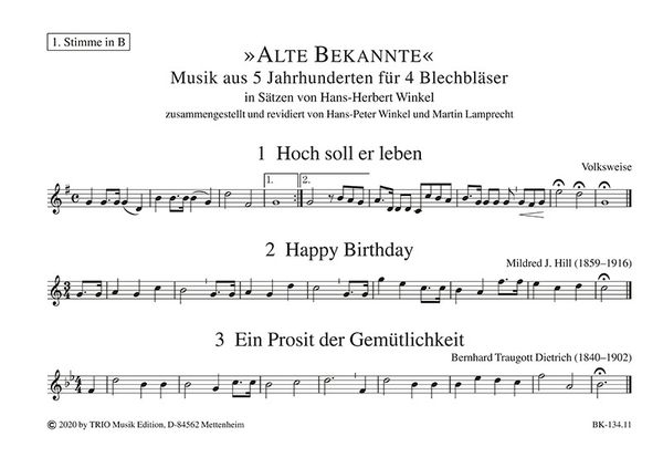 Winkel, Hans-Peter, arr. zusammengestellt und revidiert von Hans-Peter Winkel und Martin Lamprecht Aus einer umfangreichen Sammlung vierstimmiger Blechbläserbearbeitungen des Münchner Cellisten und Komponisten Hans-Herbert Winkel (1913-1999) wurden für diese Ausgabe insgesamt 52 populäre Titel aus verschiedenen Genres ausgewählt. Von Tanzsätzen der Renaissance über geistliche Musik der Klassik bis hin zu Volksliedern und Evergreens ist alles mit dabei und in praktischen Stimmheften im A5-Querformat zusammengefasst. Auf eine Partitur konnte aufgrund der klaren Struktur der Sätze verzichtet werden. Hier findet man Melodien voller Nostalgie in adäquat umgesetzter Tonsprache. Kurz gesagt: Ein Heft für alle Gelegenheiten und ein vielversprechendes Treffen mit alten Bekannten! Folgende Stimmhefte sind erhältlich: 1. Stimme in B 1. Stimme in C 2. Stimme in B 2. Stimme in C 3. Stimme in C 3. Stimme in B basso 3. Stimme in F 4. Stimme in C 4. Stimme in B basso Inhalt: I ZUM AUFTAKT 1 Hoch soll er leben 2 Happy Birthday 3 Ein Prosit der Gemütlichkeit II BAROCK 4 As ik u vinde (16. Jh.) 5 Rondo und Saltarello (Tielmann Susato, um 1510-nach 1570) 6 Tanz I (Erasmus Widmann, um 1600) 7 Tanz II (Erasmus Widmann) 8 Gagliarda (Erasmus Widmann) 9 Curranta I (Erasmus Widmann) 10 Curranta II (Erasmus Widmann) 11 Lieb Elslein (Ludwig Senfl, 1486-1543) 12 Largo aus der Oper »Xerxes« (Georg Friedrich Händel, 1685-1759) 13 Mein Stimme klinge (Valentin Rathgeber, 1682-1750) 14 Caro mio ben (Tommaso Giordani, 1730-1806) III KLASSIK / ROMANTIK 15 Jägerchor aus der Oper »Der Freischütz« (Carl Maria von Weber, 1786-1826) 16 Wiegenlied (Franz Schubert, 1797-1828) 17 Kleiner Marsch (Hans-Herbert Winkel, 1913-1999) 18 Wiegenlied (Bedrich Smetana, 1824-1884) 19 Wiegenlied (Franz Schubert, 1797-1828) IV GEISTLICH 20 Es ist bestimmt in Gottes Rat (Felix Mendelssohn Bartholdy, 1809-1847) 21 Harre meine Seele (César Malan, 1787-1864) 22 Die Himmel rühmen (Ludwig van Beethoven, 1770-1827) 23 Allein Gott in der Höh (Nikolaus Decius, 1485 nach 1546) V SPIRITUAL 24 Evry time I feel the Spirit 25 Nobody knows the trouble 26 Go, tell it on the mountain 27 When the Saints go marching in VI VOLKSLIED 28 Der Mond ist aufgegangen (Johann Peter Abraham Schulz, 1747-1800) 29 Ännchen von Tharau (Simon Dach, 1605-1659) 30 Aus der Jugendzeit (Robert Radecke, 1830-1911) 31 Im Frühtau zu Berge 32 Auf, auf zum fröhlichen Jagen 33 Der Lindenbaum (Franz Schubert, 1797-1828) 34 Ach, wie ists möglich dann (Friedrich Wilhelm Kücken, 1810-1882) 35 In einem kühlen Grunde (Johann Ludwig Friedrich Glück, 1793-1840) 36 Wohlauf, die Luft geht frisch und rein (Valentin Eduard Becker, 1814-1890) 37 Stenka Rasin (Russisches Volkslied) 38 Santa Lucia (Neapolitanisches Volkslied) 39 Letzte Rose The Last Rose of Summer (Irisches Volkslied, Sir John Stevenson,1761-1833) VII ALPENLÄNDISCH 40 Wallfahrten gehn 41 Auerhahn 42 Bayerischer Ländler 43 Bauernmadl 44 Dachauer 45 Neubayerischer VIII SCHLAGER / EVERGREENS 46 Oh! Susanna I Come From Alabama (Stephen Foster, 1826-1864) 47 Old Folks At Home Swanee River (Stephen Foster) 48 Kalinka (Russisches Volkslied) 49 La Paloma (Sebastián de Yradier, 1809-1865) 50 Rosamunde-Polka (Jaromír Vejvoda, 1902-1988) 51 Die Juliska aus Budapest (Fred Raymond, 1900-1954) 52 Kasatschok (Russischer Tanz)