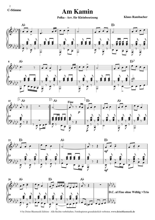 Polka Inspiriert durch einen romantischen Abend 'Am Kamin' bei Kerzenschein und einem guten Wein, schrieb der fränkische Komponist und Arrangeur Klaus Rambacher diese wunderschöne Melodie. Die böhmische Polka lässt keine Wünsche offen. Nach einem Eingangsteil, den das Orchester nach Belieben auch wunderbar mährisch phrasieren darf, kommen Zug um Zug alle Register solistisch zur Geltung. Die Überleitungen sind auffallend elegant und spätestens im melodiösen Trio wird diese Polka auch Ihr Publikum in ihren Bann ziehen!