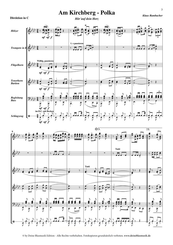 Mit 'Am Kirchberg' zündet Klaus Rambacher abermals ein Feuerwerk an böhmischen Melodien, die sofort ins Ohr gehen. Im Bereich Mittelstufe angesiedelt, ist die Polka leicht spielbar und fordert dennoch alle Register gleichermaßen. Die Orchestration, für die der Komponist selbst verantwortlich zeichnet, bietet mit lange Phrasen, verspielten Hölzern, immer wieder teils überraschenden, aber unaufdringlichen Effekten in verschiedenen Registern, ein rundes Gesamtwerk.