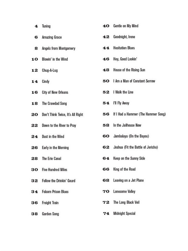 1. River 2. Early in the Morning 3. Swing low, Sweet Chariot 4. Lonesome Valley 5. The Wabash Cannon Ball 6. On The Road Again 7. Angels From Montgomery 8. Worried Man Blues 9. My Home's Across the Blue Ridge Mountains 10. Keep on the Sunny Side 11. Water Is Wide 12. Pack Up Your Sorrows 13. Amazing grace 14. Miss The Mississippi And You 15. Wabash Blues 16. Freight train 17. Wade in the Water 18. I Am A Man Of Constant Sorrow 19. Follow The Drinkin' Gourd 20. Down To The River To Pray 21. The Red River Valley 22. Rock island line 23. This train 24. I'll Fly Away 25. Blowin' in the Wind 26. SHADY GROVE 27. The Crawdad Song 28. The Erie Canal 29. House of the Rising Sun 30. Joshua (Fit The Battle Of Jericho) 31. Hesitation Blues 32. Mr. Bojangles 33. Shenandoah 34. Midnight special 35. Rocky Top 36. Chug-A-Lug 37. Cindy 38. City Of New Orleans 39. Don'T Think Twice, It'S All Right 40. Wagon Wheel 41. Dust in the Wind 42. Will the Circle be Unbroken 43. Five Hundred Miles 44. Folsom Prison Blues 45. Garden Song 31. Hesitation Blues 32. Mr. Bojangles 33. Shenandoah 34. Midnight special 35. Rocky Top 36. Chug-A-Lug 37. Cindy 38. City Of New Orleans 39. Don'T Think Twice, It'S All Right 40. Wagon Wheel 41. Dust in the Wind 42. Will the Circle be Unbroken 43. Five Hundred Miles 44. Folsom Prison Blues 45. Garden Song 46. Gentle On My Mind 47. Goodnight, Irene 48. Turn! Turn! Turn! (To Everything There Is A Season) 49. Hey, Good Lookin' 50. Old Dan Tucker 51. I Walk the Line 52. If I Had A Hammer (The Hammer Song) 53. In The Jailhouse Now 54. Jambalaya (On The Bayou) 55. King Of The Road 56. Leaving on a Jet Plane 57. The Long Black Veil 58. My Heroes Have Always Been Cowboys 59. The Night They Drove Old Dixie Down 60. Oh Mary Don't You Weep 61. Sixteen Tons 62. So Long It's Been Good To Know Yuh (Dusty Old Dust) 63. Take me Home, Country Roads 64. Tennessee Waltz 65. This Land Is Your Land 66. Tennessee Stud 67. You are My Sunshine 68. The Weight