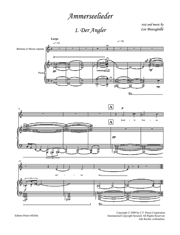 Lake Ammer in Bavaria inspired the prize-winning American/Australian composer, conductor, horn player, and poet Lee Bracegirdle to write a German song cycle premiered by baritone Didier Frédéric and the Sydney Symphony Orchestra led by Reinbert de Leeuw. Within its 23 minutes and five episodes, the singer's spare observations, over a colorful post-Romantic accompaniment, reveal beautiful details found in the grand inevitability of life.