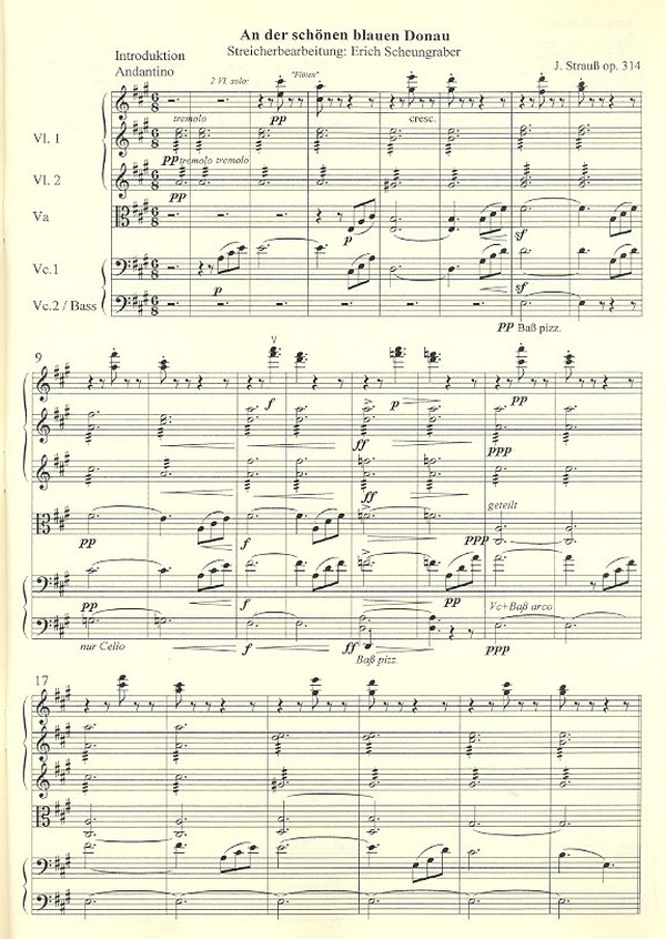 Scheungraber, Erich, arr. Johann Strauß (1825-1899) hat seine Walzerfolge An der schönen blauen Donau op. 314 im Jahr 1867 zuerst für Chor und Orchester konzipiert und dem Wiener-Männer-Gesang- Verein gewidmet. Auf der Pariser Weltausstellung ließ er eine reine Instrumentalfassung spielen und in dieser Version gelangte das Stück sofort zu Weltruhm. Die bisher bekannten Streicherfassungen des Walzers sind vierstimmig gehalten, damit auch Streichquartette sie bei Gelegenheiten spielen können. Diese Neubearbeitung für Streichorchester von Erich Scheungraber erhält in einem bis zu 8-stimmiges Arrangement möglichst viel von der Farbigkeit des Originals. Durch Auslassung des 3. und 5. Walzers wurde das Werk auf ca. 7 Minuten gestrafft. Schwierigkeitsgrad: mittel bis etwas schwieriger bis zu 8-stimmiges Arrangement, das möglichst viel von der Farbigkeit des Originals erhält Cello1 als Melodiestimme wie im Original Straffung auf ca. 7 Minuten, durch Auslassung des 3. und 5. Walzers Das Werk ist auf CD erschienen. Erhältlich bei: Junges Streichorchester Weil www.jungesstreichorchester.de