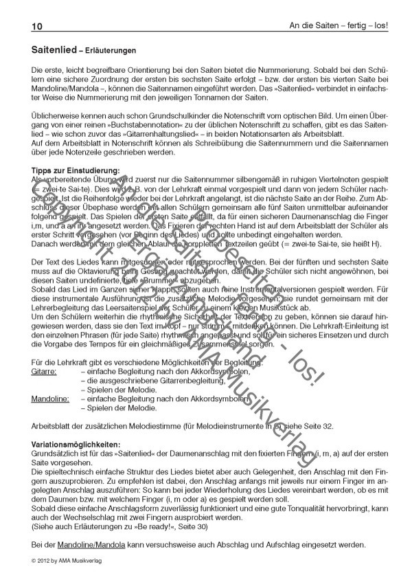 Das Unterrichtswerk »An die Saiten fertig los!« bietet Material für den Unterricht auf den Instrumenten Gitarre, Mandoline und Mandola in großen Schülergruppen (ab ca. 6 Schüler) bis hin zu der üblichen Klassenstärke der allgemeinbildenden Schulen (ca. 25 Schüler). Im Mittelpunkt dieses Unterrichtsprogrammes steht von Anfang an das gemeinsame Musizieren im Ensemble mit klanglich attraktiven Ergebnissen: Der erste Kontakt mit dem Instrument soll über eine »elementare Musizierpraxis« erfolgen, bei der erste, grundlegende Kenntnisse zum Spielen auf dem Instrument vermittelt werden. Auf diesem Weg ist es möglich, vielleicht überhaupt erst einmal Interesse an der weiteren Beschäftigung mit Musik und dem Erlernen des Instruments zu wecken bzw. den schon vorhandenen Wunsch nach musikalischer Betätigung zu vertiefen. In diesem Sinne kann das Unterrichtswerk »An die Saiten fertig los!« als Orientierungsstufe gesehen werden, in der eine nachhaltige Motivation für das Erlernen von Gitarre, Mandoline oder Mandola geschaffen werden soll. Diese Orientierungsstufe ist dem traditionellen Instrumentalunterricht vorgeschaltet und versteht sich als »Musikalisierungs- und Motivationsebene«. In dieser Funktion als Musizierpraxis mit Instrumenten kann »An die Saiten fertig los!« in vielen Bereichen des Unterrichts eingesetzt werden: an Musikschulen für den Unterricht in Großgruppen oder für »Schnupperkurse«, an Ganztagsschulen für Instrumentalangebote in Form von Arbeitsgemeinschaften (AGs), im Rahmen von Kooperationen zwischen Musikschulen und allgemeinbildenden Schulen bei Projekten wie Klassenmusizieren und Musikklassen, für den Einstieg in die Instrumentalausbildung und die Nachwuchsförderung in Zupforchestervereinen. Das Unterrichtswerk ,,An die Saiten fertig los! bietet Material für den Unterricht auf den Instrumenten Gitarre, Mandoline und Mandola in großen Schülergruppen (ab ca. 6 Schülern) bis hin zu der üblichen Klassenstärke der allgemeinbildenden Schulen (ca. 25 Schüler). Im Mittelpunkt dieses Unterrichtskonzeptes steht von Anfang an das gemeinsame Musizieren im Ensemble mit klanglich attraktiven Ergebnissen: Der erste Kontakt mit dem Instrument soll über eine 'elementare Musizierpraxis' erfolgen, bei der erste grundlegende Kenntnisse zum Spielen auf dem Instrument vermittelt werden. In diesem Sinne kann das Unterrichtswerk ,,An die Saiten fertig los! als Orientierungsstufe gesehen werden, in der eine nachhaltige Motivation für das Erlernen von Gitarre, Mandoline oder Mandola geschaffen werden soll. Diese Orientierungsstufe ist dem traditionellen Instrumentalunterricht vorgeschaltet und versteht sich als Musikalisierungs- und Motivationsebene. Somit ist das Lehrwerk ab der zweiten Grundschulklasse bis zur zweiten Klasse an den weiterführenden Schulen (Altersgruppe ca.: 7 bis 12 Jahre) einsetzbar. Die Unterrichtsdauer des zeitlich befristeten Unterrichts nach diesem Konzept ist abhängig vom Einstiegsalter der Kinder und erstreckt sich über ein bis zwei Jahre. Das ,,Lehrerhandbuch enthält den Unterrichtsstoff der Schülerhefte, alle Lehrerbegleitstimmen und Melodie-Zusatzstimmen, grundsätzliche methodisch-didaktische Hinweise, Erläuterungen zu jedem Kapitel für die Umsetzung des Konzeptes im Unterricht, einen Stoffgliederungsplan für die Verteilung des Unterrichtsstoffes auf ein Schuljahr (ca. 40 Unterrichtseinheiten), exemplarische Beschreibungen der ersten beiden Unterrichtsstunden. Die fünf Bände erlauben einen vielfältigen Einsatz bei verschiedenen Arten des Unterrichts in: Gitarrengruppen oder -klassen, Zupferklassen mit Gitarre, Mandoline und Mandola, in Ensembles mit Gitarren/Zupfinstrumenten und Zusatzinstrumenten (Querflöte, Blockflöte, Violine, Akkordeon u. Ä.), reinen Mandolinengruppen oder Mandolinenklassen. In der Funktion als ,,Musizierpraxis mit Instrumenten kann das Konzept in vielen Bereichen der Musikausbildung eingesetzt werden: an Musikschulen für den Unterricht in Großgruppen oder für 'Schnupperkurse', an Ganztagsschulen für Instrumentalangebote in Form von Arbeitsgemeinschaften (AGs), im Rahmen von Kooperationen zwischen Musikschulen und allgemeinbildenden Schulen bei Projekten wie Klassenmusizieren und Musikklassen, für den Einstieg in die Instrumentalausbildung und Nachwuchsförderung in Zupforchestervereinen. Der zweite Lehrerband 'Ergänzende Materialien für die Grundschule' enthält erweiterndes Unterrichtsmaterial zu den einzelnen Lernschritten, das besonders auf Kinder im Grundschulalter zugeschnitten ist. Dieser Band besteht aus Arbeitsblättern für die Schüler, erläuternden Hinweisen für die Lehrkräfte und allen Begleitstimmen.