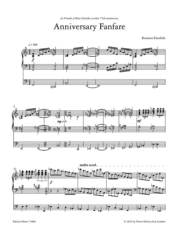 "This short work was as gift to Friends of Kent Churches, who asked me to composer something for their 75th Anniversary. The melodies and harmonies are formed out of the note letter names: Friends of Kent Churches (?h? as in the Bach-ian B flat). It lasts approximately 1 minute and 30 seconds. First performed at All Saints Church, Maidstone, by Philip Horley on 21st September, 2024."