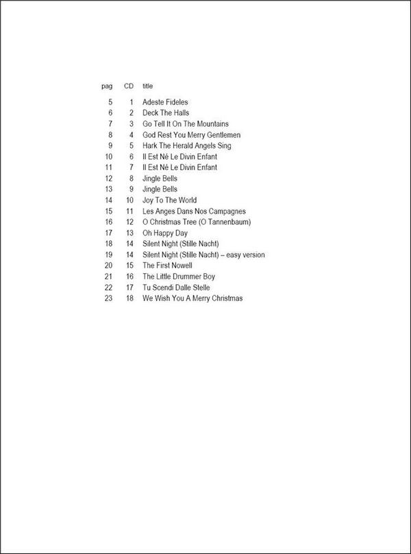 Cappellari, Andrea, arr. 16 Carols Favorites Adeste Fideles Deck the Halls Go tell it on the Mountains God rest you merry Gentlemen Hark, the Herald Angels sing Il est ne' le divin Enfant Jingle Bells Joy to the World Les Anges dans nos Campagnes O Christmas Tree (O Tannenbaum) Oh happy Day Silent Night (Stille Nacht) The first Nowell The little drummer Boy Tu scendi dalle stelle We wish you a merry Christmas