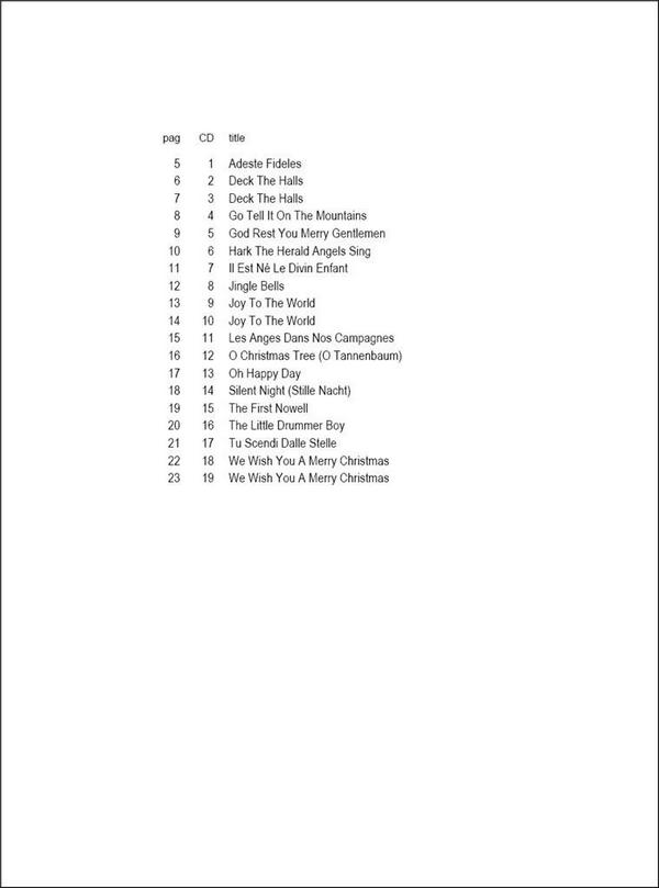 Cappellari, Andrea, arr. 16 Carols Favorites Adeste Fideles Deck the Halls Go tell it on the Mountains God rest you merry Gentlemen Hark, the Herald Angels sing Il est ne' le divin Enfant Jingle Bells Joy to the World Les Anges dans nos Campagnes O Christmas Tree (O Tannenbaum) Oh happy Day Silent Night (Stille Nacht) The first Nowell The little drummer Boy Tu scendi dalle stelle We wish you a merry Christmas