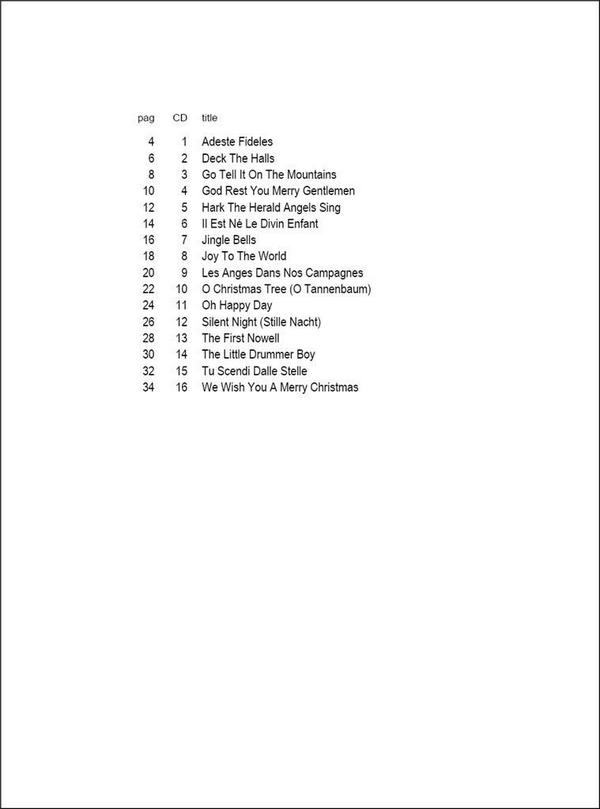Cappellari, Andrea, arr. 16 Carols Favorites Adeste Fideles Deck the Halls Go tell it on the Mountains God rest you merry Gentlemen Hark, the Herald Angels sing Il est ne' le divin Enfant Jingle Bells Joy to the World Les Anges dans nos Campagnes O Christmas Tree (O Tannenbaum) Oh happy Day Silent Night (Stille Nacht) The first Nowell The little drummer Boy Tu scendi dalle stelle We wish you a merry Christmas