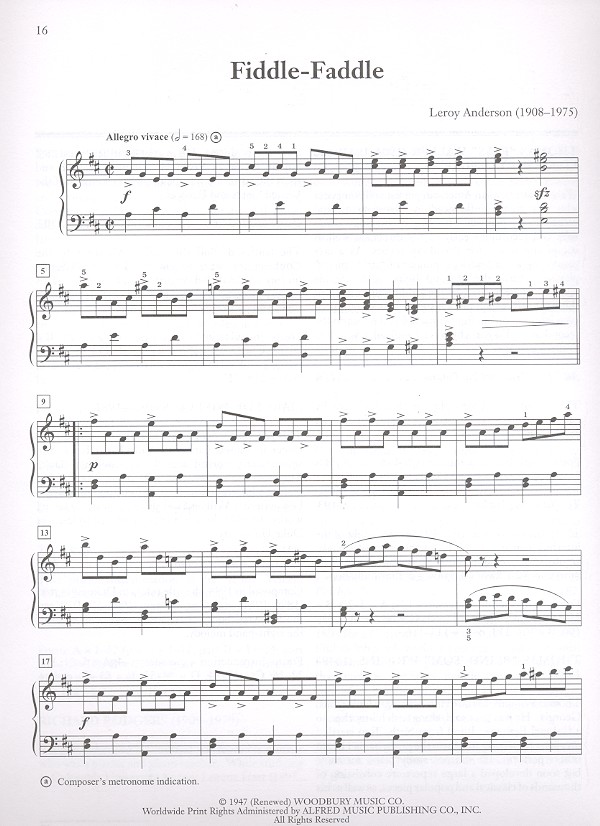Hinson, Maurice, ed 12th Street Rag (Bowman) All That Meat and No Potatoes (Waller) Barcarolle op.28,1 (Beach) Battle of Manassas (Wiggins) Bethena (A Concert Waltz) (Joplin) Blue Moon (Rodgers) Blue Rondo a la Turk (Brubeck) Boogie Woogie Etude (Gould) The Cat and the Mouse (Scherzo Humoristique) (Copland) Columbia (Caprice Americaine on My Old Kentucky Home) (Gottschalk) Dizzy Fingers (Confrey) Do Nothin' Till You Hear from Me (Ellington) Don't Get Around Much Anymore (Ellington) The Duke and the Count (Williams) Eager Beaver (Kenton) Euphonic Sounds (A Syncopated Two Step) (Joplin) Fiddle-Faddle (Anderson) In a Mist (Beiderbecke) Jazz Pizzicato (Anderson) The Jitterbug Waltz (Waller) Juba (Dett) Kitten on the Keys (Confrey) The Lake at Evening op.5,1 (Griffes) Laura (Mercer/Raksin) Love Song (Barber) The Man I Love (Gershwin) March Wind, op.46,10 (MacDowell) Medley---Campfire on the Ice (Finney) Narcissus op.14,4 (Nevin) Nola (Arndt) Old Folks at Home (Way Down Upon the Swanee River) (Foster) On Bended Knees (Burleigh) Over the Rainbow (Arlen/Harburg) Pavanne (Gould) Prelude (Novelette in Fourths) (Gershwin) Prelude II (Blue Lullaby) (Gershwin) Sleigh Ride (Anderson) Swanee (Gershwin) The Syncopated Clock (Anderson) Tiger Rag (Original Dixieland Jazz Band) Variations on Adeste Fideles (Taylor) Yankee Doodle (Arranged as a Rondo) (Carr)