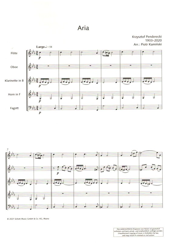 aus "3 Stücke im alten Stil" nach dem Original für Streichorchester Krzysztof Pendereckis gefühlvolle 'Aria' gilt längst als Standardwerk. Die an barocke Ostinati verweisende harmonische Struktur bildet die Grundlage für die arios gestaltete Cantilene. Ursprünglich für Streichorchester komponiert, liegt das Werk nun als Bearbeitung für Bläserquintett vor und bereichert das Repertoire als kurzes Intermezzo im Konzertprogramm.