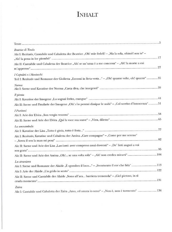 Ah la pena in lor piombò (Beatrice di Tenola) Ah la morte a cui m'appresso (Beatrice di Tenola) Oh quante volte oh quante ((I Capuleti e i Montecchi) Casta diva che inargenti (Norma) Lo sognai ferito esangue ((Il pirata) Oh s'io potessi dissipar le nubi - Col sorriso d'innocenza (Il pirata) Son vergin vezzosa (I Puritani) Qui la voce sua soave - Vien diletto (I Puritani) Tutto è gioia tutto è festa (La sonnambula) Care compagne - Come per me sereno - Sovra il sen la man mi posa (La sonnambula) Lasciami aver compreso assai dovresti - De' lieti auguri a voi son grata (La sonnambula) Oh se una volta sola - Ah non credea mirarti (La sonnambula) Sventurato il chor che fida (La straniera) Un grido io sento (La straniera) Sono all'ara barriera tremenda - Ciel pietoso in sì crudo momento (La straniera) Amo ed amata io sono - Non è non è tormento (Zaira)