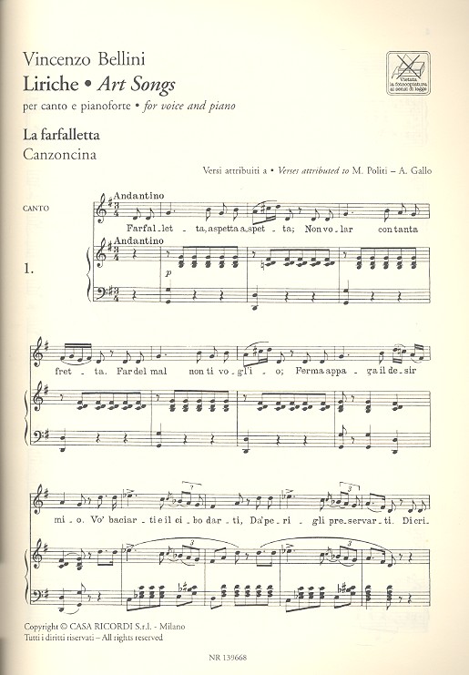 La farfalletta Quando incise su quel marmo Sogno d'infanzia L'abbandono L'allegro marinaro Torna vezzosa Fillide 3 ariette: Il fervido desiderio Dolente immagine di Fille mia Vaga luna che inargenti 6 ariette: Malinconia ninfa gentile Vanne o rosa fortunata Bella Nice che d'amore Almen se non poss'io Per pietà bell'idol mio Ma rendi pur contento