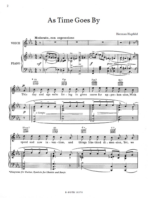 Originalfassung (mit Strophe und Refrain) Bekannt ist Hupfelds Song bis heute vor allem als ikonische Melodie aus dem Hollywood-Melodram ,?Casablanca? von 1942. Doch Hupfeld hatte es schon viel früher geschrieben. Es gehörte zu einem Bündel an ,?Reserve-Songs?, die für Broadway-Musicals zur Verfügung standen, 1931 wurde es schließlich in der Show ,?Everybody?s Welcome? eingesetzt. Die Produzenten von ,?Casablanca? übernahmen den Song in den Film. Max Steiner, der Komponist der Filmmusik zu ?Casablanca?, lehnte es dann aber ab, ihn im Film zu belassen. Doch die entscheidenden Bilder waren bereits gedreht. Weil Ingrid Bergman schon andere Verpflichtungen hatte, konnten die Szenen mit ,?As Time Goes By? nicht nachgedreht werden. Das Lied blieb im Film ? und wurde so zum Welterfolg.