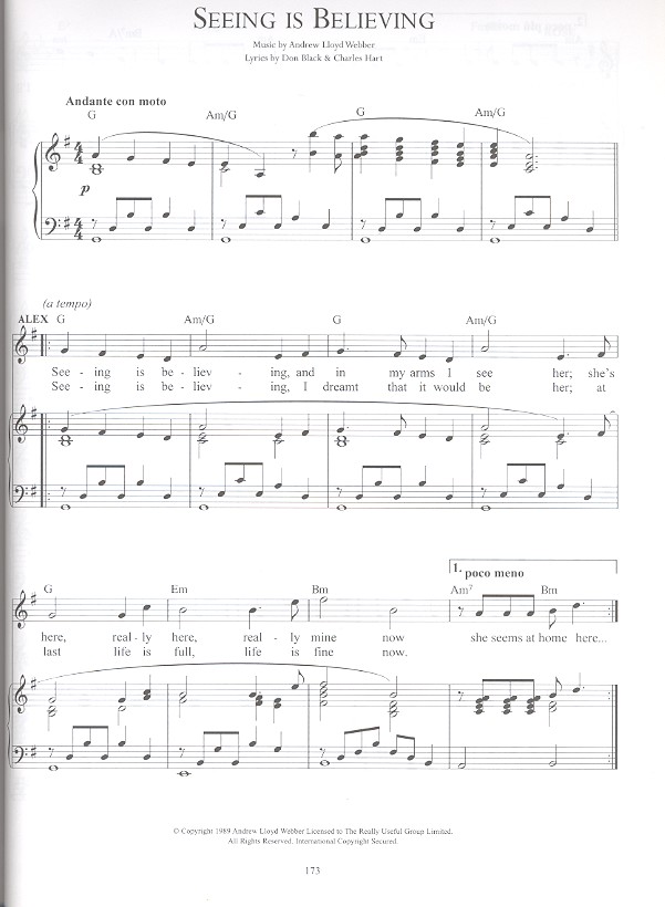 A Strange And Lovely Song (The Likes Of Us) All For Laura (The Woman In White) All I Ask Of You (The Phantom Of The Opera) All The Love I Have (The Boys In The Photograph) Amigos Para Siempre (Olympic Theme) Another Suitcase In Another Hall (Evita) Any Dream Will Do (Joseph And The Amazing Technicolor Dreamcoat) As If We Never Said Goodbye (Sunset Boulevard) Buenos Aires (Evita) Close Every Door (Joseph And The Amazing Technicolor Dreamcoat) Crazy (Starlight Express) Dance The Dance Don't Cry For Me Argentina (Evita) Evermore Without You (The Woman In White) Gethsemane (Jesus Christ Superstar) God's Own Country (The Boys In The Photograph) Half A Moment (By Jeeves) I Believe In My Heart (The Woman In White) I Don't Know How To Love Him (Jesus Christ Superstar) King Of My Heart (Joseph And The Amazing Technicolor Dreamcoat) Learn To Be Lonely (The Phantom Of The Opera) Let Us Love In Peace (The Boys In The Photograph) Light At The End Of The Tunnel (Starlight Express) Love Changes Everything (Aspects Of Love) Love's Maze (By Jeeves) Macavity: The Mystery Cat (Cats) Memory (Cats) Mr. Mistoffelees (Cats) Next Time You Fall In Love (Starlight Express) No Matter What (Whistle Down The Wind) Pie Jesu (Requiem) Prologue (Joseph And The Amazing Technicolor Dreamcoat) Seeing Is Believing (Aspects Of Love) Starlight Express (Starlight Express) Sunset Boulevard (Sunset Boulevard) Tell Me On A Sunday And Variations (Song And Dance) The Boys In The Photograph (The Boys In The Photograph) The Music Of The Night (The Phantom Of The Opera) The Perfect Year (Sunset Boulevard) The Phantom Of The Opera (The Phantom Of The Opera) The Vaults Of Heaven (Whistle Down The Wind) Unexpected Song (Song And Dance) Whistle Down The Wind (Whistle Down The Wind) With One Look (Sunset Boulevard) You Made Me Think You Were In Love (Song And Dance) You Must Love Me (Evita)