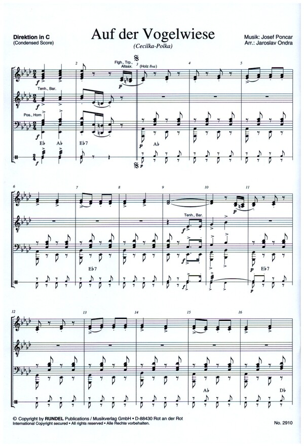 Cecilka-Polka Tonart: As/Des-Dur Josef Poncar zählt wie seine bedeutenden Zeitgenossen Jaromír Vejvoda und Karel Vacek zu den 'Großen' Komponisten der böhmischen Unterhaltungsmusik. Er blieb stets seiner ländlichen Atmosphäre und Thematik treu. Eines seiner bekanntesten Werke ist die Polka 'Auf der Vogelwiese'. Trotz seiner Vorliebe für die Musik war Josef Poncar in seinem Hauptberuf bei der Eisenbahn beschäftigt.