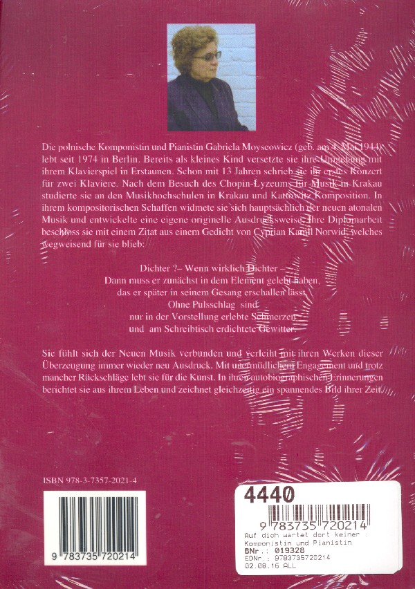Autobiographie 'Auf dich wartet dort keiner.' Das ist zwar nicht unbedingt das, was man als guten Wunsch einer Mutter erwartet, wenn jemand alles hinter sich lässt und die Hoffnung auf das Leben in einem anderen Land setzt. Doch Gabriela Moyseowieczs Leben ist eben auch nicht geradlinig verlaufen. Aber sie hat es trotz mancher Hindernisse geschafft, sich in Deutschland ihren Traum zu erfüllen: zu komponieren und zu musizieren. Und so sind es denn auch Impressionen, die die Komponistin und Pianistin aus ihrem Leben zusammengetragen hat und die pünktlich zu ihrem 70. Geburtstag erschienen sind. Das Buch versammelt Erinnerungen an die Eltern, an einzelne Begebenheiten wie auch an die verschiedenen Lehrer, die sie in musikalischer Hinsicht prägten. Es sind persönliche Erinnerungen, bisweilen ein Zwiegespräch mit dem Leser, bisweilen kritische Anmerkungen, Impressionen einer bescheiden gebliebenen Musikerin.