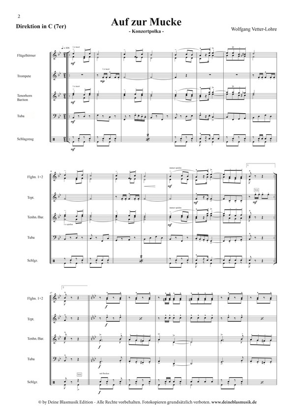 Nach dem großen Erfolg seiner 'Schräglage' kommt mit 'Auf zur Mucke' abermals eine Konzertpolka aus der Feder von Wolfito Vetter. Seinem Motto, neue Wege in der Blasmusik zu gehen, bleibt er treu und schafft es, ungewöhnliche Melodienbögen so auszukleiden, dass sie trotzdem Ohrwurmcharakter haben.