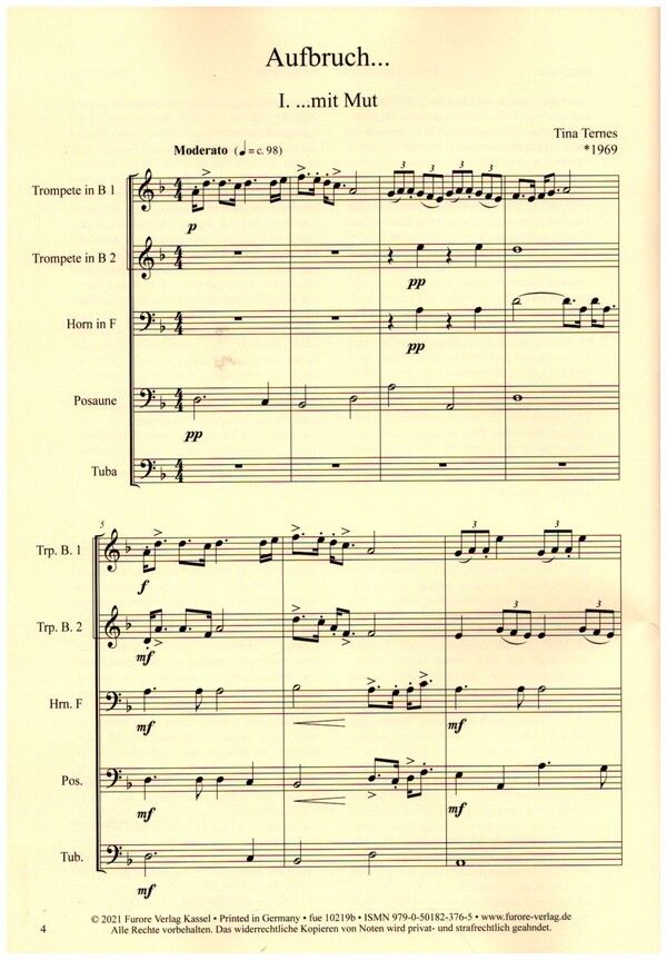 | Untertitel: | für 2 Trompete, Horn in F, Posaune und Tuba (klingend notiert) Partitur und Stimmen |