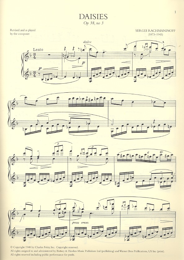 Original compositions: 6 songs op.38,3 (Daisies) (revised version) Etudes-tableaux op.33,8 Etudes-tableaux op.39,2 Etudes-tableaux op.39,8 Fragments Lilacs op.21,5 (revised version) Moments musicaux op.16,3 Moments musicaux op.16,5 Morceaux de fantasie op.3,1 (Elégie) Morceaux de fantasie op.3,2 (Prelude in C minor) Morceaux de fantasie op.3,5 (Sérénade) (revised version) Morceaux de salon op.10,2 (Valse) Morceaux de salon op.10,5 (Humoresque) (revised version) Ten preludes op.23,5 Ten preludes op.23,10 Thirteen preludes op.32,5 Thirteen preludes op.32,11 Transcriptions: Minuet (from Bizet) The flight of the bumble-bee (from Rimsky-Korsakoff)
