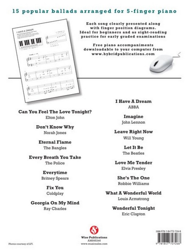 Easiest 5-Finger Collection Can You Feel The Love Tonight? [John, Elton] Don't Know Why [Jones, Norah] Eternal Flame [Bangles, The] Every Breath You Take [Police, The] Everytime [Spears, Britney] Fix You [Coldplay] Georgia On My Mind [Charles, Ray] I Have A Dream [Abba] Imagine [Lennon, John] Leave Right Now [Young, Will] Let It Be [Beatles, The] Love Me Tender [Presley, Elvis] She's The One [Williams, Robbie] What A Wonderful World [Armstrong, Louis] Wonderful Tonight [Clapton, Eric]
