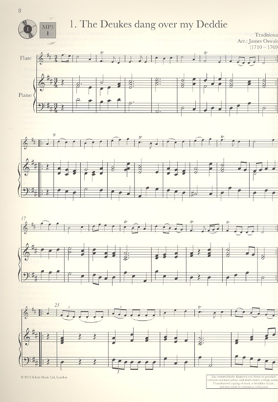 Knight, Annabel, arr. The Deukes dang over my Deddie (Oswald) A Solo from an Ancient Manuscript - Largo (Oswald) A Solo from an Ancient Manuscript - Allegro Assai (Oswald) Tambourins from Nais (Rameau) Gavotte Vive Pour Les Zephirs (Rameau) Air 'La Furstemberg' (Purcell) Non à Si Vago e Bello (Händel) Minuet from Berenice (Händel) Schlummert ein BWV 82 (Bach) L'Auvergnate (Pignolet de Montéclair) Sommeil des Festes de L'Ete (Pignolet de Montéclair) Largo e-Moll op.3,7 (Loeillet of London) Allegro ma non trippo e-Moll op.3,7 (Loeillet of London) Andante (Telemann) Siciliana (Telemann) Allemando (Bodin de Boismortier) Gavotta (Bodin de Boismortier) Grave (Barsant) Allegro (Barsant) Affettuoso (Hasse) Andante (Hasse) Sarabande (Schickhardt) Allegro (Schickhardt) Ravenscroft's Fancy (Ravenscroft) Auretti's Dutch Skipper Dance (Anonymus)