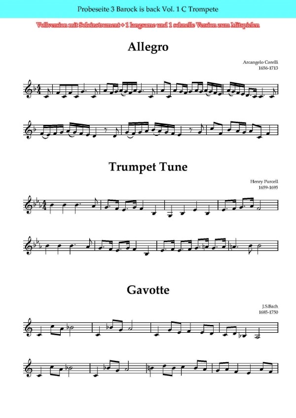 Playalong-CD mit Sinfonie-Orchester und Rhythmus-Gruppe Freude schöner Götterfunken (Beethoven) Marsch Nr.2 (Raisch) Tanz des Bürgermeisters (Schein) Largo aus Sinfonie Nr.9 (Aus der neuen Welt) (Dvorak) Menuett (Bach) Morisca (Susato) Barock is back (Raisch) Hornpipe (Händel) Prelude aus dem Te Deum (Charpentier) Allegro (Corelli) Trumpet Tune (Corelli) Allemande (Purcell) Gavotte (Schein) Triumphmarsch (Verdi) Trumpet Voluntary (Purcell) Der Frühling (Vivaldi) Sarabande (Händel) Air (Bach) Can Can (Offenbach) Meeting with G.F. Händel (Raisch) Ave Maria (Bach) Die Moldau (Smetana) Marsch (Händel) Birthday Medley (Raisch)