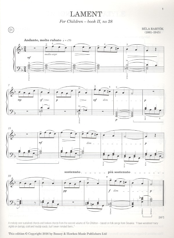The definitive Bartók Edition Davies, Hywel, ed Lament Tavern Song In Folk Song Style Jest Dance of the Slovaks The Two Pigeons Peasant's Flute Jeering Song Romanian Song Change in Time In Valachian Style Dance from Bucsum Dialogue no.3 Hungarian Folk Song Dawn Maid's Song Sash Dance In One Spot Swine-herd's Song Teasing Song Canon Stick Dance Bulgarian Rhythm (1) Bulgarian Rhythm (2) Melody in the Mist Harmonics Jack-in-the-Box From the Diary of a Fly Bear Dance