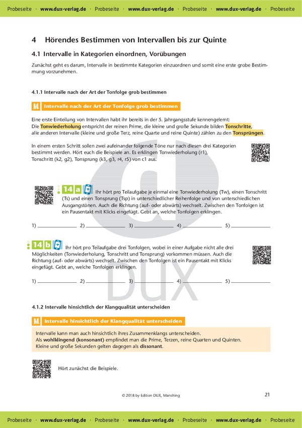 LehrplanPLUS Arbeitsheft für den Musikunterricht an Gymnasien Aspekte der Artikulation Aspekte der Metrik und Rhythmik Taktwechsel Zusammengesetzte Taktarten Triole Feinbestimmung der Intervalle bis zur Oktave Hörendes Bestimmen von Intervallen bis zur Quinte Intervalle in Kategorien einordnen, Vorübungen Intervalle nach der Art der Tonfolge grob bestimmen Intervalle hinsichtlich der Klangqualität unterscheiden Intervalle mit Hilfe charakteristischer Liedanfänge bestimmen Differenziertes Hören von Intervallen Kleine und große Sekunde hörend unterscheiden Kleine und große Terz hörend unterscheiden Reine Quarte und reine Quinte hörend unterscheiden Tonleitern in Dur und Moll Aufbau und Bildung der Dur- und Moll-Tonleiter Hörendes Erkennen von Dur- und Moll-Tonleitern Dreiklänge in Dur und Moll Aufbau des Dur- und Moll-Dreiklangs Dur- und Moll-Dreiklang in Grundstellung hörend unterscheiden Umkehrung des Dreiklangs Dur- und Moll-Dreiklang in Grundstellung und Umkehrungen erkennen und bestimmen Vorübungen Die Stellung eines Dreiklangs bestimmen Aspekte der Form Möglichkeiten der Motivverarbeitung Sequenz Umkehrung Reihung Reihung Verfremdung Liedformen Zweiteilige Liedform: Strophe und Refrain Dreiteilige Liedform Rondo Aspekte der Satztechnik Unisono Unisono Polyphoner Satz und Imitation