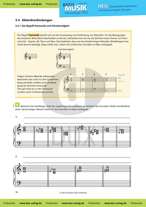 Basis Musik 7 basiert auf dem LehrplanPLUS des bayerischen Gymnasiums. Die Neuauflage 2025 knüpft in den wesentlichen Bereichen an das bisherige Konzept der Reihe Basis Musik an, berücksichtigt aber nun noch mehr die spezifische Unterrichtssituation. Für das Erlernen der Inhalte des Lernbereichs 4 Musik und ihre Grundlagen ist in der Neuauflage deutlich mehr Übungsmaterial vorhanden. Um den unterschiedlichen Gegebenheiten in Schulen gerecht zu werden, sind viele Übungen so angelegt, dass die Lehrkraft selbst über die konkrete Ausgestaltung entscheiden kann. Die zusätzlichen Lerninhalte für die musische Ausbildungsrichtung sind in das Heft so integriert, dass sie von Schülerinnen und Schülern, die andere Ausbildungsrichtungen besuchen, ebenfalls sinnvoll genutzt werden können. Selbstverständlich sind in Basis Musik 2025 viele Anknüpfungen an die Kompetenzen und Inhalte der weiteren Lernbereiche enthalten. Basis Musik 5 liegt in einer gedruckten und einer digitalen Version vor. Die digitale Version von Basis Musik 5 ist unter der Bestellnummer D 1218-DIG erhältlich. Für Lehrer/-innen ist die digitale Version mit Lösungsvorschlägen gegen Nachweis des Erwerbs mindestens eines Klassensatzes von Basis Musik 5 als interaktives PDF kostenlos erhältlich (D 1218L). Hörbeispiele sind in Form von QR-Codes im Heft enthalten. In der digitalen Version sind diese direkt als Link zu Webseiten angelegt, die durch Anklicken geöffnet werden können.