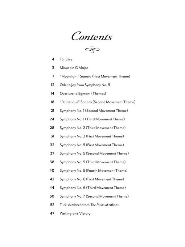 Fur Elise, WoO 59 Minuet In G Major Piano Sonata No. 14 In C# Minor (Moonlight) Op. 27, No. 2, First Movement Theme Ode To Joy Overture To Egmont Symphony No. 6 In F Major (Pastoral) Third Movement Symphony No. 5 In C Minor, First Movement Excerpt Symphony No. 5, Fourth Movement Excerpt Symphony No. 5, Second Movement Excerpt Symphony No. 5, Third Movement Excerpt Symphony No. 6 In F Major (Pastoral), First Movement Excerpt Symphony No. 7 In A Major, Second Movement (Allegretto) Symphony No. 1, Third Movement Excerpt Symphony No. 1, Andante, Second Movement Symphony No. 3, First Movement Symphony No. 2, Third Movement Excerpt Theme From Pathetique Sonata Turkish March Wellington's Victory