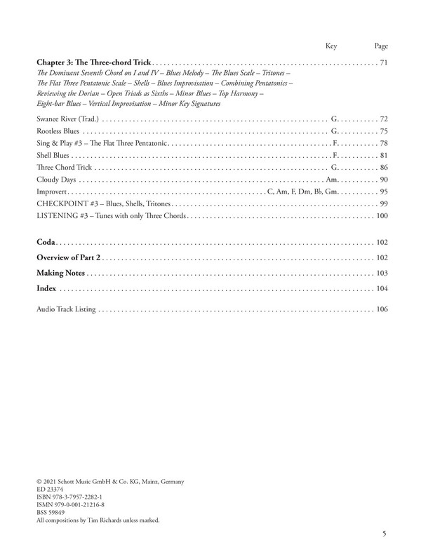 Schott Pop-Styles An introduction to swing, blues, latin and funk Part 1: Everything You Need To Get Started Beginning Jazz Piano richtet sich an Spielerinnen und Spieler mit geringen Vorkenntnissen, die Spaß am Erkunden jazzverwandter Musik haben. Mit vielen gut klingenden Spielstücken - eigenen Kompositionen, Traditionals und neuen Melodien zu bekannten Jazz-Songs - führt Tim Richards an den Blues, Funk und die lateinamerikanische Musik heran und erklärt die wichtigsten Techniken für die rechte und linke Hand. Der erfahrene Pädagoge und Autor der von der Kritik gefeierten Lehrwerke Blues Piano und Jazz Piano orientiert sich dabei u.a. auch an den Anforderungen des ABRSM-Prüfungskatalogs, was das Lehrwerk zu einer unverzichtbaren Übe- und Lernressource macht. Band 1 (ED 23374) erklärt auf einfache Weise, wie man spontan und frei über Harmonien spielen kann. Beginnend mit Dreiklängen in der linken Hand werden hier zunächst Fünftonleitern und Arpeggios sowie die Bluestonleiter erklärt und an konkreten Stücken ausprobiert. Gespickt mit typischen Rhythmen und Bassgrooves von Swing bis Latin macht Band 2 (ED 23379) dann Lust auf das Klavier als Begleitinstrument und zeigt darüber hinaus, wie man eine Melodie im Jazzkontext arrangieren kann. Die beiden Bände sind im gleichen Schwierigkeitsgrad gehalten und können sowohl nacheinander als auch parallel zueinander genutzt werden. Die Audio-Dateien umfassen Vollversionen und Play-Along-Tracks, mit Tim Richards am Klavier, einer zusätzlichen Basslinie und Schlagzeug. Besonders empfehlenswert nicht nur für Autodidakten ist das interaktive Feature 'Replay': In Kooperation mit 'MusicGurus', einem Anbieter hochwertiger Online-Lessons, können kostenlose, interaktive Noten zu allen Spielstücken online abgerufen werden, die das Üben erleichtern und einen schnellen Lernerfolg garantieren.