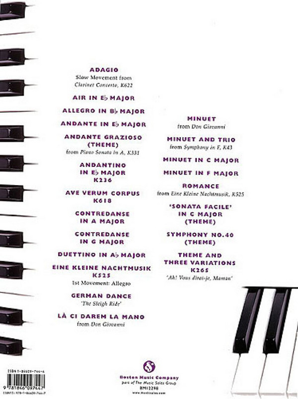 Adagio from Clarinet Concerto KV622 Air in Eb Major Allegro in Bb Major Andante in Eb Major Andante grazioso from Piano Sonata in A Major KV331 Andantino in Eb Major KV236 Ave verum corpus KV618 Contredanse in A Major Contredanse in G Major Duettino in Ab Major Allegro from Eine kleine Nachtmusik KV525 German Dance (The Sleigh Ride) Là ci darem la mano from Don Giovanni Minuet from Don Giovanni Minuet and Trio from Symphony in F KV43 Minuet in C Major Minuet in F Major Romance from Eine kleine Nachtmusik KV525 Theme from Sonata facile in C Major Theme from Symphony no.40 Theme and 3 Variations KV265 (Ah vous dirai-je Maman)