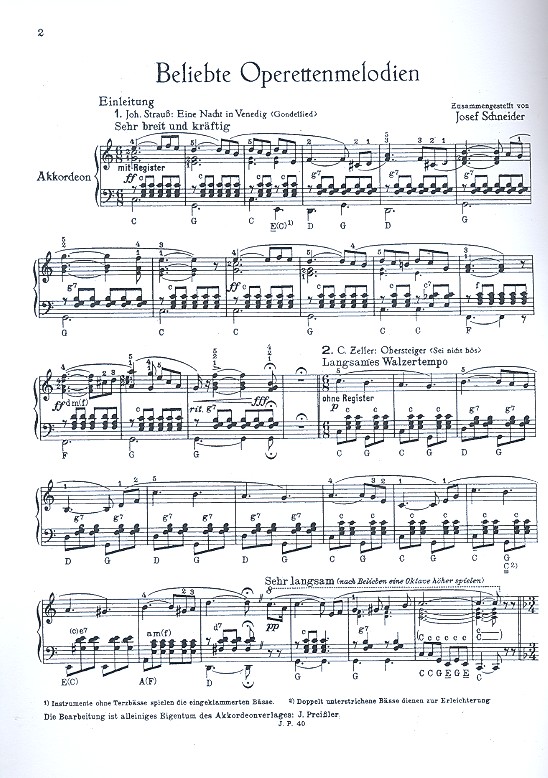 Schneider, Josef, Bearb. Gondellied (Eine Nacht in Venedig) Sei nicht bös (Obersteiger) Wer hat euch getraut (Zigeunerbaron) Anzoletto und Estrella (Gasparone) Wie mein Ahn'l zwanzig Jahr (Vogelhändler) Ach ich hab sie ja nur (Bettelstudent) Oje oje wie rührt mich dies (Fledermaus) Aus dem Marsch-Couplet des Zsuspan (Zigeunerbaron) Ja man kann sich leicht blamieren (Vogelhändler)