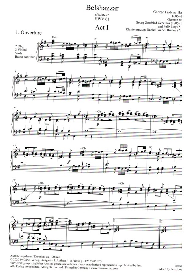 Belshazzar ist mit seinen ausführlichen Szenenanweisungen und den vielen kurzen Formen wie Accompagnato-Rezitativen und Ariosi das dramatischste unter Georg Friedrichs Händels Oratorien. De facto handelt es sich sogar um eine geistliche Oper, die aber wegen des Bühnenverbots für biblische Handlungen im damaligen England die Form des Oratoriums, d. h. der nichtszenischen Aufführung, wahren musste. Händel wählte dafür einen der packendsten Stoffe der Welt- und Religionsgeschichte: den Fall Babylons und die Befreiung des jüdischen Volkes. Die neue Carus-Urtextausgabe bringt alle drei aufführbaren Fassungen des Werks: die der Uraufführung von 1745 sowie die Umarbeitungen von 1751 und 1758. Erstmals folgt die Edition konsequent der Dirigierpartitur Händels, die Klarheit über die von Händel tatsächlich aufgeführten Stücke gibt. Als Ergänzung ist in der Ausgabe die bereits vor der Uraufführung gestrichene Arie 'Lament not thus' ergänzt, damit sind alle von Händel für Belshazzar komponierten Chöre und Arien zusammen verfügbar, bis zu den späten, kaum bekannten Arien 'Wise men' und 'Fain would I know'. Erste Urtext-Ausgabe Erstmals alle drei aufführbaren Fassungen des Werks in einer Ausgabe Konsequent basierend auf der Dirigierpartitur Händels Mit Ergänzung der bereits vor der Uraufführung gestrichenen Arie 'Lament not thus'