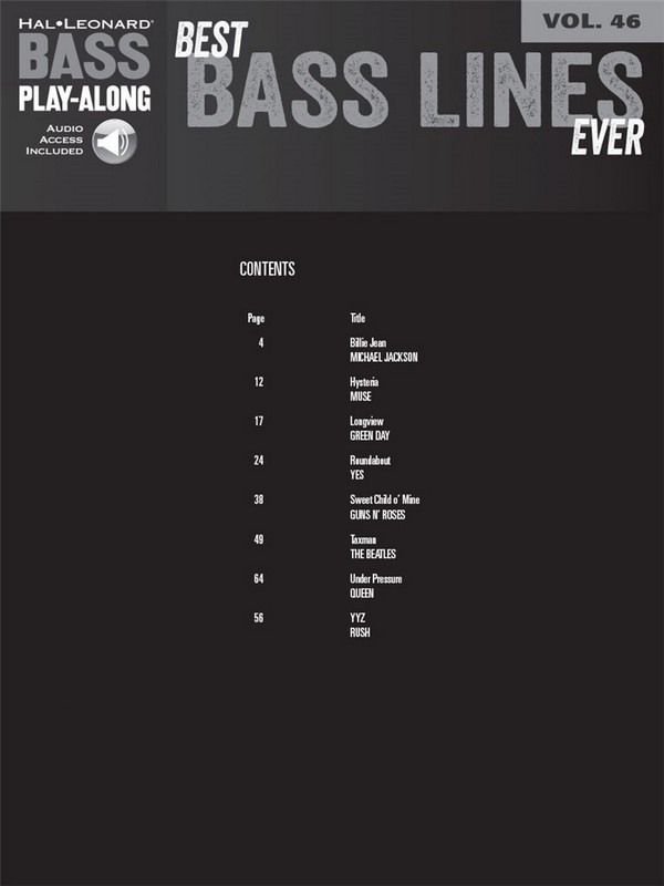 The Bass Play-Along Series will help you play your favorite songs quickly and easily! Just follow the tab, listen to the audio to hear how the bass should sound, and then play along using the separate backing tracks. The melody and lyrics are also included in the book in case you want to sing, or to simply help you follow along. The purchase price includes online access to audio for download or streaming. Billie Jean (Michael Jackson) Hysteria (Muse) Longview (Green Day) Roundabout (Yes) Sweet Child O' Mine (Guns N' Roses) Taxman (The Beatles) Under Pressure (Queen) YYZ (Rush)