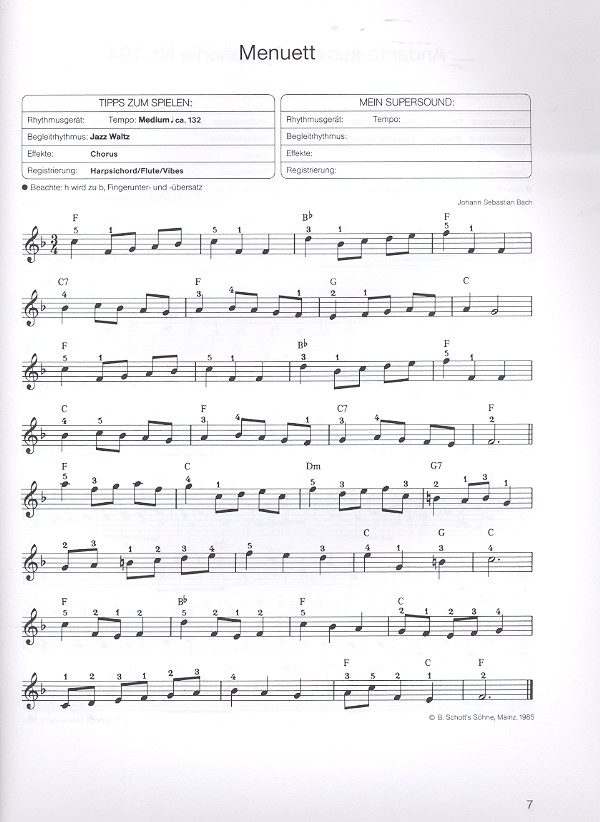 Keyboard Klangwelt Boarder, Stephen, arr. über 90 Keyboard-Hits Classical Instrumentals: Charpentier: Te Deum Bach: Menuett Haydn: Andante aus der Symphonie Nr. 104 Mozart: Türkischer Marsch Mozart: Thema aus der Klaviersonate in A Beethoven: Für Elise Beethoven: Freude, schöner Götterfunken Beethoven: Romanze Schubert: Wiegenlied Weber: Jägerchor aus "Der Freischütz" Schumann: Fröhlicher Landmann Schumann: Träumerei Chopin: Melodie von Chopin Liszt: Liebestraum Rubinstein: Melodie Smetana: Die Moldau Brahms: Ungarischer Tanz Nr. 5 Brahms: Ungarischer Tanz Nr. 6 Brahms: Walzer Nr. 15 Verdi: Triumphmarsch Tschaikowsky: Neapolitanisches Lied Bizet: Die Liebe vom Zigeuner stammt Schumann: Wilder Reiter Schumann: Soldatenmarsch Mozart: Reich mir die Hand mein Leben Grieg: Norwegischer Tanz Lortzing: Holzschuhtanz Grieg: Solvejgs Lied Mozart: Eine kleine Nachtmusik Mozart: Treibt der Champagner Mozart: Das klinget so herrlich Mozart: Der Vogelfänger bin ich ja Weber: Wir winden dir den Jungfernkranz Mendelssohn: Hochzeitsmarsch Chopin: Prélude Wagner: Treulich geführt Händel: Largo Schubert: Zum Sanctus Gounod: Ave Maria Humperdinck: Abendsegen Schubert: Ständchen Gretchaninoff: Nach dem Balle Kreisler: Liebeslied Franck: Les Plaintes d'une Poupée Mozart: Thema aus dem Klarinettenkonzert Gretchaninoff: Ein altes Gedicht Verdi: Freiheits-Chor der Gefangenen Chopin: Largo Cantabile Rubinstein: Melodie in F Beethoven: Mondschein-Sonate Chopin: Nocturne Gretchaninoff: Der kleine Gernegroß Godard: Berceuse de Jocelyne Chopin: Regentropfen-Prélude Delibes: Valse Lente Verdi: Chor der Gefangenen Walzer und mehr...: Strauss: Wein, Weib und Gesang Strauss: Wiener-Blut Strauss: Donauweibchen Strauss: Schatz-Walzer Strauss: Geschichten aus dem Wienerwald Strauss: An der schönen blauen Donau Strauss: Du und Du Strauss: Rosen aus dem Süden Strauss: Lagunen-Walzer Traditinal: Candlelight-Waltz Strauss: Walzer aus "Der lustige Krieg" Weber: Bauernwalzer Suppé: Dichter und Bauer Strauss: Morgenblätter Strauss: Frühlingstimmenwalzer Fibich: Poème Strauss: Mein Herr Marquis Millöcker: Carlotta-Walzer Strauss: Komm in die Gondel Strauss: Kaiser-Walzer Strauss: Ha, welch ein Fest Millöcker: Ach, ich hab' sie ja nur auf die Schulter geküsst Millöcker: Dunkelrote Rosen Zeller: Wie mein Ahnl zwanzig Jahr Traditional: Love Waltz Koop: Waltz for You Traditional: Oh Danny Boy Märsche: Strauss: Radetzky-Marsch Schrammel: Wien bleibt Wien Kopetzky: Egerländer Marsch Wilhelm III.: Präsentier Marsch Beethoven: Yorkscher Marsch Hauschild: Frohsinn-Marsch Piefke: Preußens Glora Spohr: Gruß an Kiel Scherzor: Bayrischer Avanciermarsch Wiener Alexander-Marsch Friedrich II.: Der Hohenfriedberger Kreuzer: Tölzer Schützen-Marsch Der Dessauer Rixner: Spanischer Marsch
