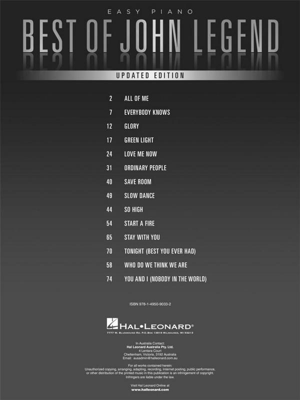 All Of Me Everybody Knows Glory Green Light Love Me Now Ordinary People Save Room Slow Dance So High Start A Fire Stay With You Tonight (Best You Ever Had) Who Do We Think We Are You And I (Nobody In The World)