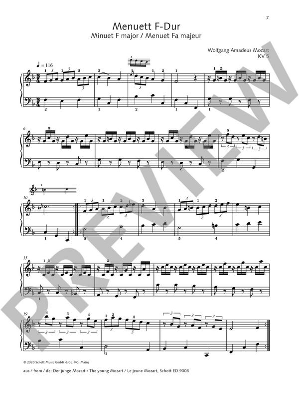 30 bekannte Stücke Best of Classics Heumann, Hans-Günter, arr. 30 Famous Pieces for Piano Mit dieser Sammlung von 30 beliebten Originalkompositionen und Bearbeitungen für Klavier legt Schott eine Auswahl der Werke Wolfgang Amadeus Mozarts vor, die jeden Pianisten begeistern wird. Neben der Sonate facile und anderen beliebten Unterrichtsstücken enthält der Band auch zahlreiche Arrangements, etwa den ersten Satz von Eine kleine Nachtmusik oder verschiedene Opernarien. Alle Stücke haben einen leichten bis mittelschweren Schwierigkeitsgrad und wurden um Fingersätze sowie Metronomvorschläge ergänzt. Die Sammlung in modernem und lesefreundlichem Druckbild empfiehlt sich nicht nur für den Unterricht, sondern auch für alle, die Klavierspielen als Hobby betreiben. Menuett G-Dur Menuett F-Dur Allegro B-Dur Menuett F-Dur Menuett C-Dur Menuett D-Dur Allegretto F-Dur Rondeau D-Dur Presto B-Dur Siciliano d-Moll Andante C-Dur Rondo C-Dur Ah, vous dirai-je, Maman C-Dur Sonate A-Dur Fantasie d-Moll Rondo D-Dur Sonate C-Dur Eine kleine Nachtmusik: 1. Satz Klavierkonzert d-Moll: 2. Satz Klavierkonzert C-Dur: 2. Satz Klavierkonzert A-Dur: 2. Satz Klarinettenkonzert A-Dur: 2. Satz Sinfonie Nr. 40 g-Moll: 1. Satz Ave verum corpus Lacrimosa Se vuol ballare, signor Contino Non più andrai, farfallone amoroso Là ci darem la mano Der Vogelfänger bin ich ja Der Hölle Rache kocht in meinem Herzen