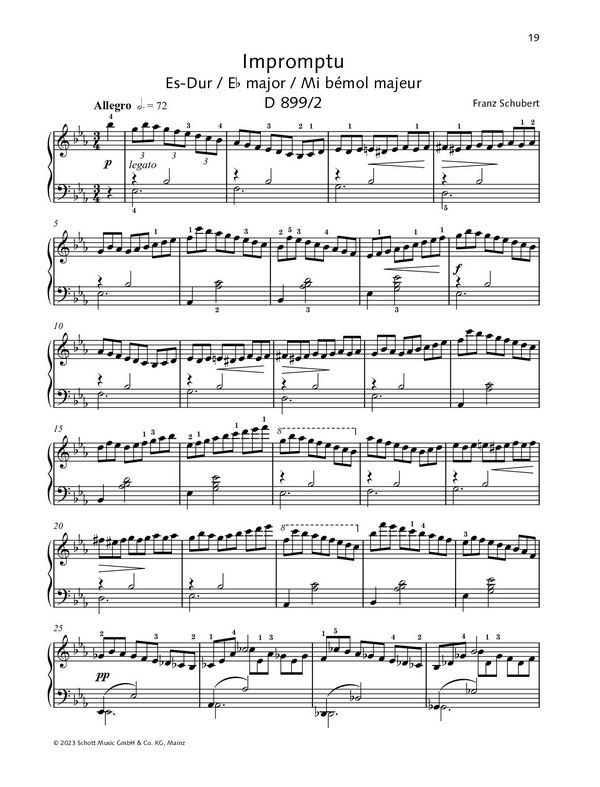 30 Famous Pieces 30 Bekannte Stücke Mit dieser Sammlung liegt eine Auswahl der Werke Franz Schuberts vor, die jeden Pianisten begeistern wird. Neben dem Sehnsuchts-Walzer und dem beliebten Impromptu Es-Dur enthält der Band auch Arrangements seiner bekanntesten Sinfonien, Kammermusikwerke und Lieder. Alle Stücke haben einen mittelschweren Schwierigkeitsgrad und wurden um Fingersätze sowie Metronom-Vorschläge ergänzt. Das lesefreundliche Druckbild empfiehlt sich nicht nur für den Unterricht, sondern auch für alle Hobby-Klavierspieler. Sehnsuchts-Walzer As-Dur, D 365/2 Ländler A-Dur, D 366/1 - Ländler B-Dur, D 378/4 - Ecossaise h-Moll, D 145/8 Ecossaise G-Dur, D 145/9 - Walzer E-Dur, D 145/1 - Ecossaise As-Dur, D 421/1 - Variation über einen Walzer von A. Diabelli in c-Moll, D 718 - Valse sentimentale G-Dur, D 779/3 - Valse sentimentale A-Dur, D 779/13 - Deutscher Tanz D-Dur, D 783/2 - Deutscher Tanz B-Dur, D 783/7 - Grazer Walzer A-Dur, D 924/10 - Valse noble G-Dur, D 969/4 - Impromptu Es-Dur, D 899/2 - Impromptu As-Dur, D 899/4 - Moment musical C-Dur, D 780/1 - Moment musical f-Moll, D 780/5 - Impromptu As-Dur, D 935/2 - Klaviersonate A-Dur, D 959 2. Satz - Sinfonie Nr. 5 B-Dur, D 485 1. Satz - Sinfonie Nr. 7 h-Moll Unvollendete, D 759 1. Satz - Sinfonie Nr. 8 C-Dur Die Große, D 944 1. Satz - Heidenröslein, D 257/3 - Ave Maria, D 839/6 - Der Lindenbaum, D 911/5 - Ständchen, D 957/4 - Forellenquintett, D 667 4. Satz - Der Tod und das Mädchen / Streichquartett d-Moll, D 810 2. Satz Ballettmusik Rosamunde, D 797 - Sanctus, D 872/5