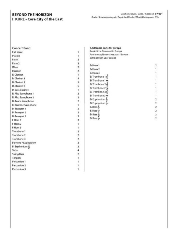 Die Sätze von Beyond the Horizon liegen in drei separaten Ausgaben vor. Sie können jeweils unabhängig voneinander gespielt werden oder aber auch als komplettes dreisätziges Gesamtwerk aufgeführt werden. Der erste Satz, ?Kure?, beschreibt die gleichnamige lebhafte japanische Stadt und ihre Umgebung. Der zweite Satz, ?Setouchi?, spiegelt das lokale Binnenmeer wider. Der dritte Satz, ?Yamato?, handelt von dem Schlachtschiff, das in der Marinewerft von Kure gebaut wurde. Drei ausdrucksstarke und stimmungsvolle Musikstücke!