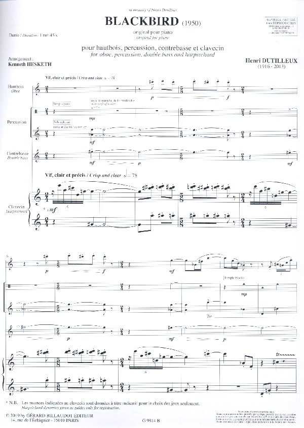 | Untertitel: | pour hautbois, percussion, contrebasse et clavecin parties |