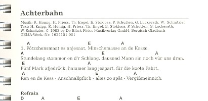201 kölsche Hits Achterbahn Adschüss Partie. Alfons dä Ampmann. Alles kann ich ligge. Alles hät sing Zick. Am Arsch der Welt Am Bickendorfer Büdche Anglerleed 2 Anita Annemie ich kann nit mieh Äppel, Nöß un Marzipan Autokino Ävver bitte bitte met Jeföhl Bahnhoff Bei de Buure Bei uns doheim Bei uns em Verein Bethlehem im Lande Judäa Betriebsausflug Bliev noch jet Bruno Blos mær jet & Bums Kapell Bütze de Luxe Buuredanz Bye bye my Love. Christopher Street Day (CSD) Dær Mürer Dær Remmel Dä kleine Lade Dä ein säät su, dä andere su Dä Manni us Ossheim Damenwahl em Stammlokal Danzschull. Dat bessje Spass Dat Wasser vun Kölle Dat wood alles für uns jemaat De Johreszigge De Mama kritt schon widder e Kind De Pänz sin us dem Hus De Scheffschöckelbremsermeisterprüfung Der treue Husar Die Drei vun dær Linie 2 Die kleine Saache Die Profis vun dær Eierquell Do beste fies op et Föttche jefalle Do han sen en dær Ärm jenomme Dovun dräum ich su lang Dr. Pillemann Drink doch eine met. Du bes die Stadt Edelweißpirate Eierquell III (Mer kannte e Mädche) Eimol em Johr Elvis lääv En dær Kayjass Nummere Null En dær Südstadt jeit et Leech aan (Fortuna Leed) En de Weetschaff op dær Eck En Kölle es et am räne En minger Bud En unserem Veedel Endlich frei Engelbät Es gibt ein Leben nach dem Tod Et brich mir et Hätz (FC-Leed) Et Foßball-Leed Et Kackleed Et Spanien-Leed Et Südstadt-Leed Finanzamp Familijedach Fescheræs Köbes Firma Huddel & Brassel Frankreich Frankreich Hätt ich doch Jeld Hämmche He deit et wih und do deit et wih Heimweh en Kölle Himmelfahrt Huusmeister Kaczmarek Ich han ænen Deckel Ich krijæe Bier un do kriß e Bier Ich wör su jän ens Weihbischof. Immer wigger Indianer kriesche nit Jede Daach es e Jeschenk Jommer noh Hus Katharina Henot Kaffeebud Katrin Kölle am Rhing Kölsch, Alt und Pils (KAP) Kölsche Bröck Kradechor Kriesch doch nit Kumm zoröck noh Kölle Langer Samstag in dær City Lappa Loma de Mallorca Leev Linda Lou Leever Jott, jev uns Zick Loss mer jet schunkele Loss mer singe Loss mer uns verdrage (Drinkleed) Lück wie ich un du Lur noh vürre Maach ens blau Maach et jot Manolito Mädche vun Nonnenwerth Mer bruche keiner Mer losse dær Dom en Kölle Met dær Harley op Jöck MGV Concordia Mi Auto Mi Leed für üch Mikado Ming eetste Fründin Ming eetste Zirett Ming allerschwerste Dach Minge Drache Minge Frisör Minge Wecker Mir dräume all dä selve Draum Mir drinken us einer Fläsch Mir han e Hätz für Kölle Mir klääve am Lääve Mir Kölsche Mir künnten Fründe weede Mir sin de Stroß eraf jejange Mir sin die Weltmeister vum Rhing Mir sin et Volk Mir sin zojefloge Moni hat geweint Morjens halver vier Morje Morje - Yarinlarda MS Monika Müllemer Kirmes Müllers Plaat Nemmt mich met Oh Herr Pänz Pänz Pänz Polterovend Prozession Pütze Hein Putschblos Rheinhotel Richmodis von Aducht Rievkoche-Walzer Rita Schnell Rollbrett Rof mer ens e Taxi Rut un wiess Schäl Sick Schäle Schang Schöferleed Schlacht bei Worringen Schötzefess Schöne Bescherung Schwatz op Wiess Schwester Inge Schwemmbad Sirtaki Sonnesick Sporthall Stelldichein Stippeföttche Stroßefess Su es et Levve Sulang dær Dom en Kölle steit Surfen am Fühlinger See Tarzan Top ävver beklopp Thekenturnverein Treck noch ens dat Kleid an Un iwich läuf dær Rhing hin zom Meer Ungeræm Adler Unsere Altreucher Unser Bäumche Unser Jrundjesetz Unsere Stammbaum Urlaub op däm Buurehoff Usjebomb Verspätung Volksjade Vüræm Hus do blös dær Wind Weetslück Weia Oweia Wenn dann de Musik spillt Wenn de Sonn schön schingk Wenn et Leech usjing em Roxy Wenn ich Beatles hür Wenn ja und warum nicht Wenn mir Kölsche singe Wick es dær Wäch noh Kevelaer Widdersin Winterdaach Wo es mi Laache Wochenplan Zahldaach Zesammestonn Zollstock Zwesche Kölle, Brabant un Flandern