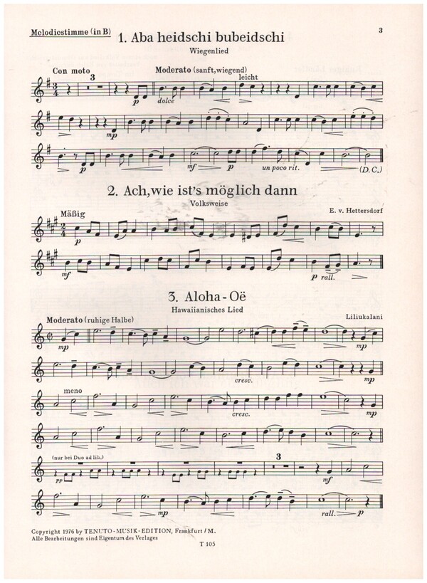Eine Sammlung weltbekannter Melodien Aba heidschi bubeidschi Ach wie ist's möglich dann Aloha oe Der alt Ausseer Postillion Am Brunnen vor dem Tore An der Weser Auch ich war ein Jüngling Aus der Jugendzeit Ave verum Bandltanz Behüt dich Gott Candlelight Waltz Cielito lindo Da streiten sich die Leut herum Down by the Riverside Du du liegst mir im Herzen Das einsame Glöckchen Echo vom Königsee Erzherzog JohannJodler Gold und Silber Greensleeves Guten Abend gute Nacht = Wiegenlied - Brahms Habe Mitleid Hab ich nur deine Liebe Happy Birthday Heideröslein Hobellied Hoch vom Dachstein Ich weiß nicht was soll es bedeuten Im schönsten Wiesengrunde In einem kühlen Grunde Kalinka Lang lang ist's her Leise flehen meine Lieder Letzte Rose Das Lieben bringt groß Freud Die Loreley Der Mond ist aufgegangen Oh Susanna Oh wie so trügerich La paloma Die Post im Walde Sah ein Knab ein Röslein stehn Santa lucia Schneewalzer Schlafe mein Prinzchen schlaf ein Solang der alte Peter Ständchen Stenka rasin Tief im Böhmerwald Tiritomba Wer uns getraut When the Saint's go marching in Wiegenlied Zwoa Brett'ln a geführiger Schnee