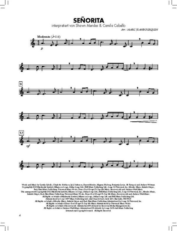 Angesagte Popnummern für den großen Auftritt Yamaha Bläserklasse Essential Elements 1. High Hopes [Panic! At The Disco] 2. Señorita [Shawn Mendes] 3. Everything I Wanted [Billie Eilish] 4. Sucker [Jonas Brothers] 5. Radioactive [Imagine Dragons] 6. Sweet But Psycho [Ava Max] 7. Shotgun [George Ezra] 8. Shake It Off [Taylor Swift] 9. Cheap Thrills (Feat. Sean Paul) [Sia] 10. Happier [Marshmello] 11. Despacito [Luis Fonsi] 12. Havana [Camila Cabello]