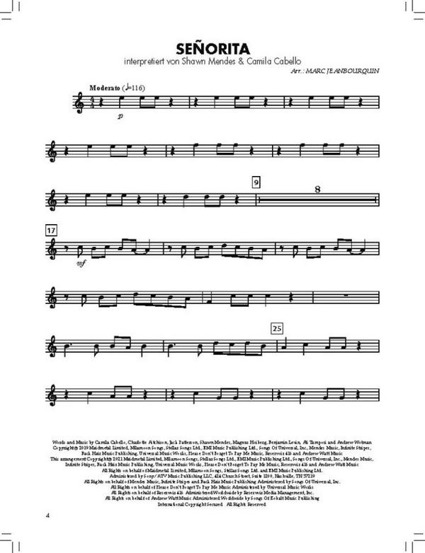 Angesagte Popnummern für den großen Auftritt Yamaha Bläserklasse Essential Elements 1. High Hopes [Panic! At The Disco] 2. Señorita [Shawn Mendes] 3. Everything I Wanted [Billie Eilish] 4. Sucker [Jonas Brothers] 5. Radioactive [Imagine Dragons] 6. Sweet But Psycho [Ava Max] 7. Shotgun [George Ezra] 8. Shake It Off [Taylor Swift] 9. Cheap Thrills (Feat. Sean Paul) [Sia] 10. Happier [Marshmello] 11. Despacito [Luis Fonsi] 12. Havana [Camila Cabello]