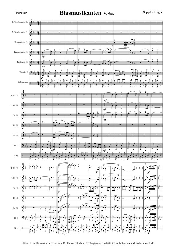 Polka Die böhmische Polka "Blasmusikanten" für 7er-Besetzung von Sepp Leitinger öffnet dem Konzertbesucher mit ihrer getragenen Melodieführung das Herz für die Blasmusik.