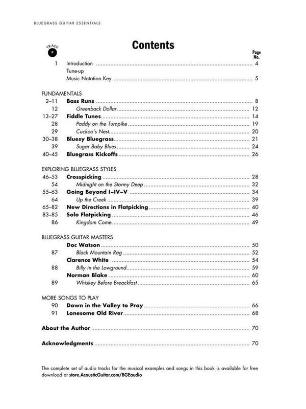 Learn the fundamentals of bluegrass by exploring its various styles and the masters who defined the genre: Doc Watson, Clarence White, and Norman Blake. The book includes background information, instruction and 12 classic songs, while the CD includes demos of the exercises and songs. 1. Billy in the Lowground 2. Black Mountain Rag 3. Cuckoo's Next 4. Down in the Valley to Pray 5. Greenback Dollar 6. Kingdom Come 7. Lonesome Old River 8. Midnight on the Stormy Deep 9. Paddy on the Turnpike 10. Sugar Baby Blues 11. Up The Creek 12. Whiskey Before Breakfast