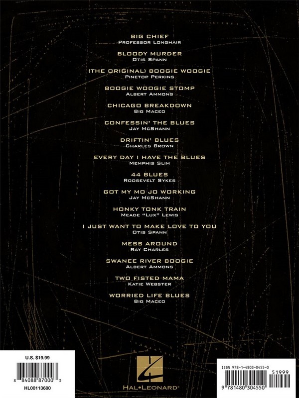 Artist Transcriptions Big Chief Bloody Murder Boogie Woogie Stomp Chicago Breakdown Confessin' The Blues Driftin' Blues Every Day I Have The Blues 44 Blues Got My Mo Jo Working Honky Tonk Train (Honky Tonk Train Blues) I Just Want To Make Love To You Mess Around (The Original) Boogie Woogie Swanee River Boogie Two Fisted Mama Worried Life Blues